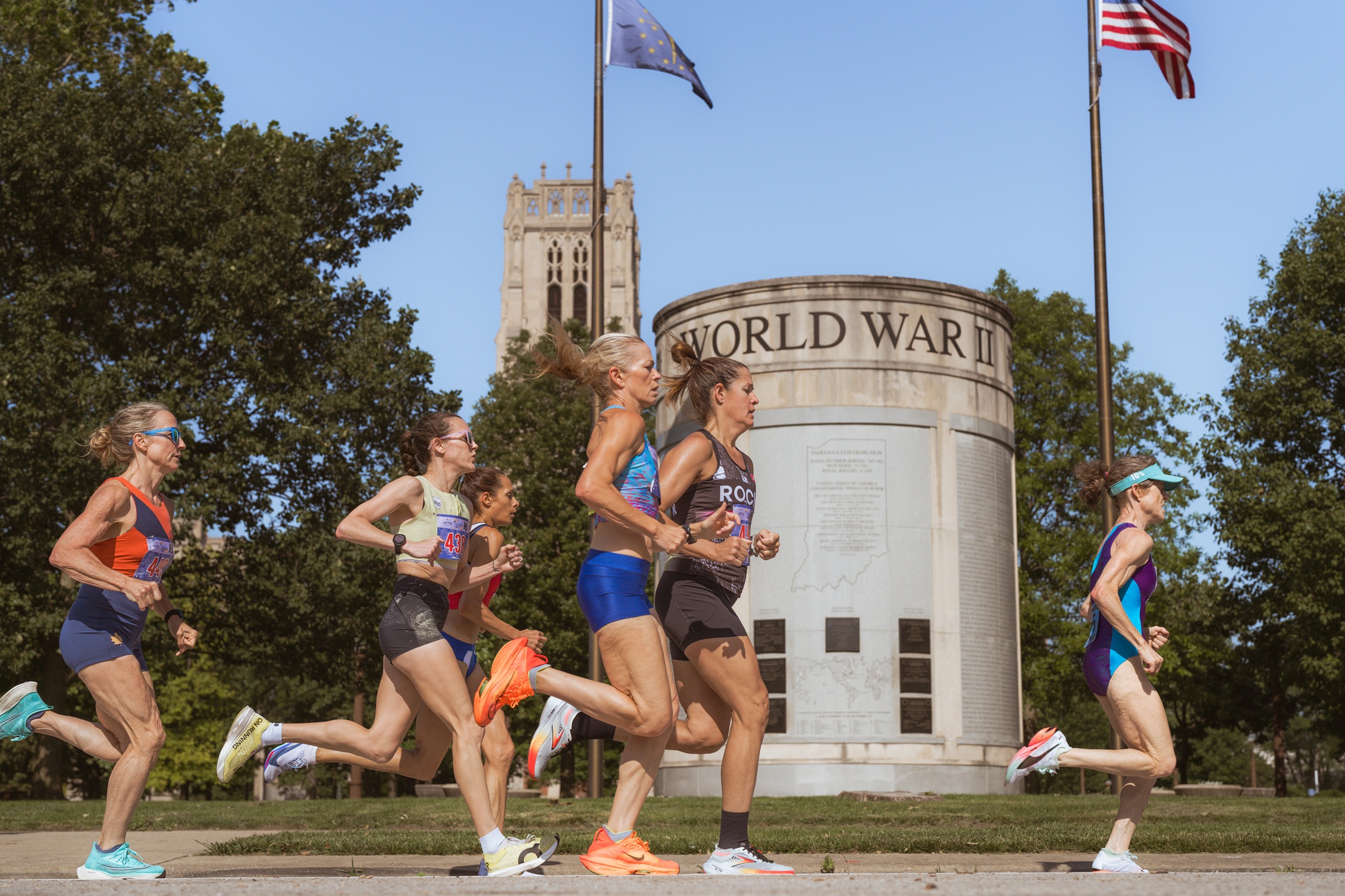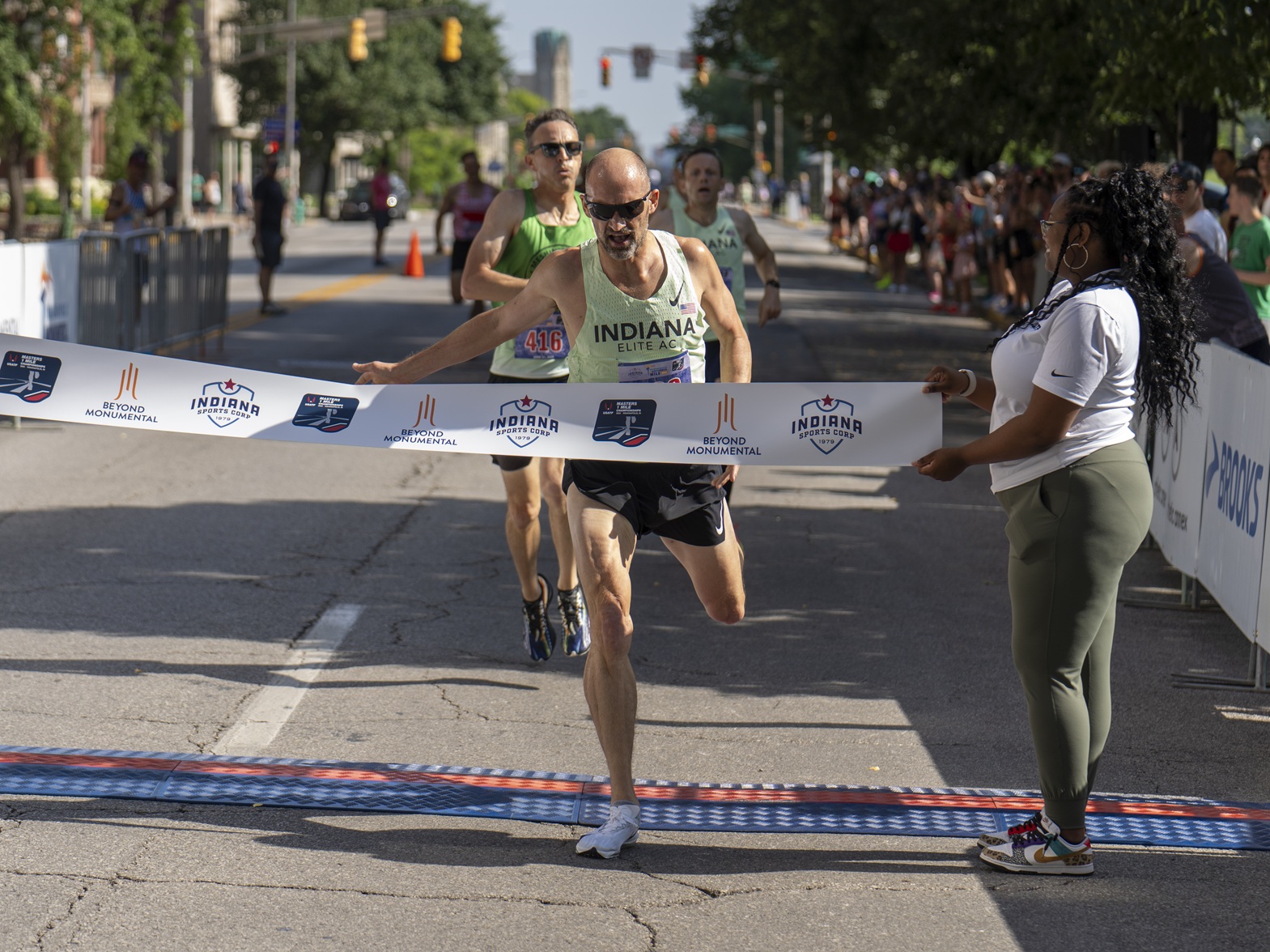 OVERALL WOMEN Note: Gun time is used for overall, age group and team results. Rohl, out of Pennsylvania, achieved the rare feat of gaining an Overall victory at a Masters Championship out of the 55-59 division. Her 5:10.25 winning time gave her a cushion of over forty meters. Closer for second, Texan Dawn Grunnagle, running in 45-49, gained the silver in 5:19.07, twelve meters ahead of Connecticut’s Jennifer St. Jean. The bronze medal went to St. Jean, a 50-54 athlete, in 5:21.81. MEN The top three competitors raced three abreast down Meridian Street, with 300 meters to go! Indiana’s Chad Carver had the best kick, winning by a half second in 4:25.10. Coloradan Anthony Bruns, from 45-49, enjoyed a fraction of a second margin over 2023 Champion and teammate of Carver, Bryan Lindsay. Bruns edged Lindsay 4:25.62 to 4:26.22.